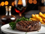 Sizzling steak and fine wine experience at gourmet restaurant upscale dining nighttime ambiance culinary delight