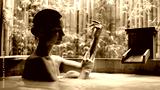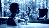 A young woman relaxes in a powdery Japanese bath in a tropical setting. Serene spa experience. Concept of spa, wellness, relaxation and rejuvenation.