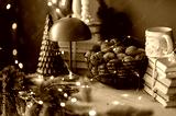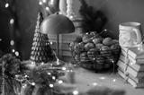 New Year's decor on the fireplace. Christmas decor. Book nuts and night light
