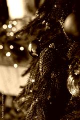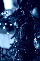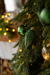 Christmas tree decorated with lights and balls. Bokeh