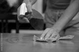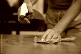 The process of cleaning a wooden surface using a spray and a cloth is quite effective