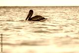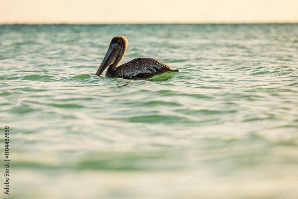 Close-up view of pelican floating on calm waters of Caribbean Sea during golden sunset. Aruba.