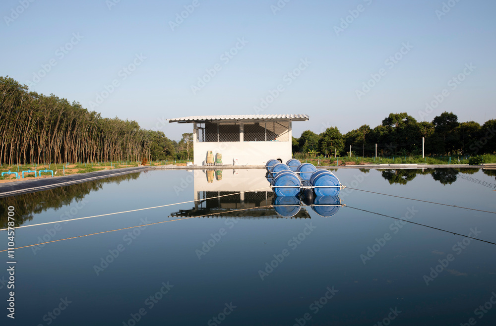 Landscape of water saving irrigation system in agriculture field. Blue bouys floating on the agriculture pool
