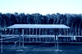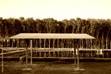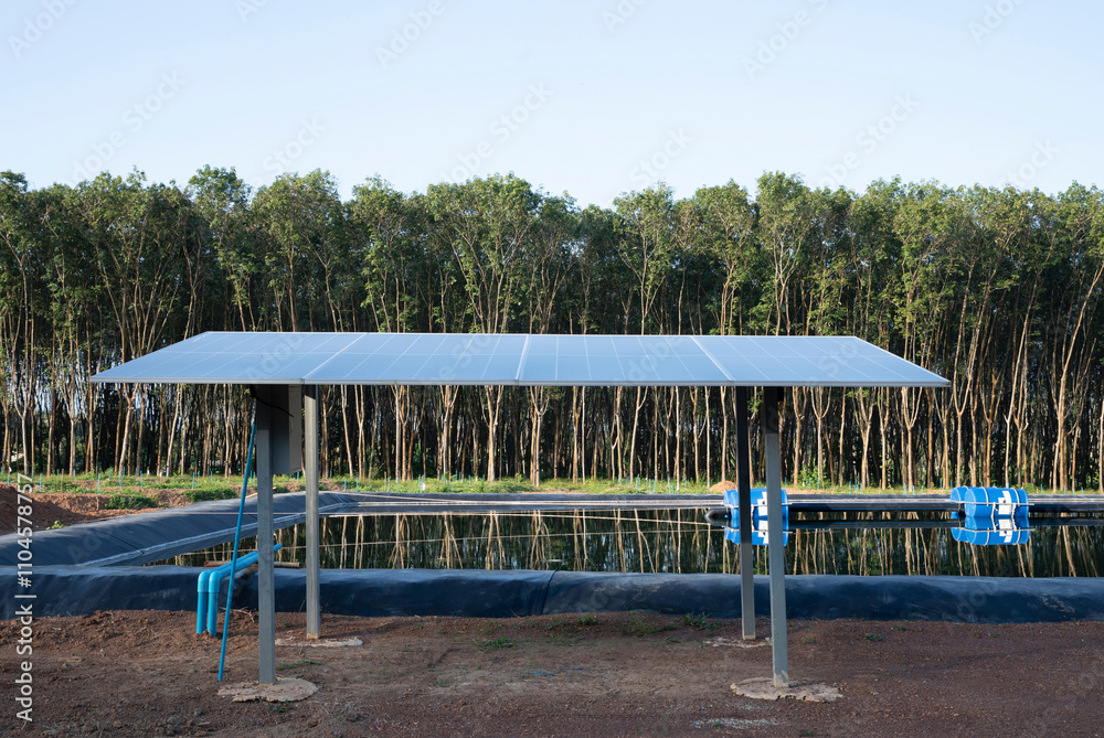 Solar cells stands near water pond for electric generating clean energy in agricultural garden.