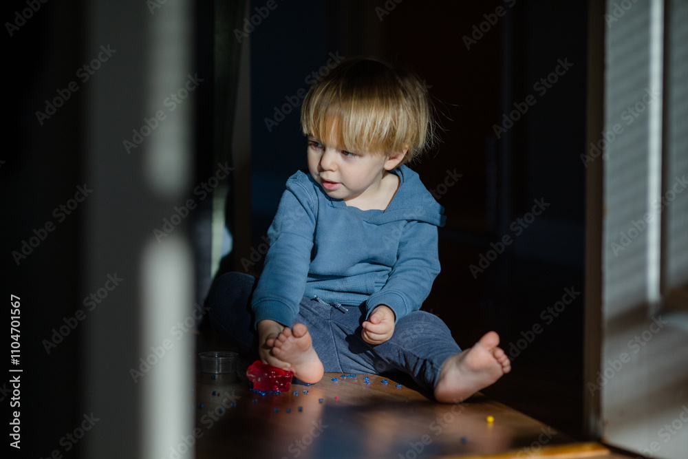 Sweet baby boy ( 1 year old ) sitting on floor at home and playing with toys at children's room.