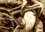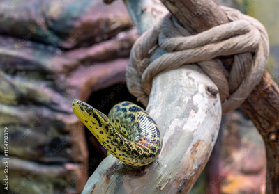 A Paraguayan anaconda crawls up a tree in close-up.
