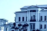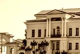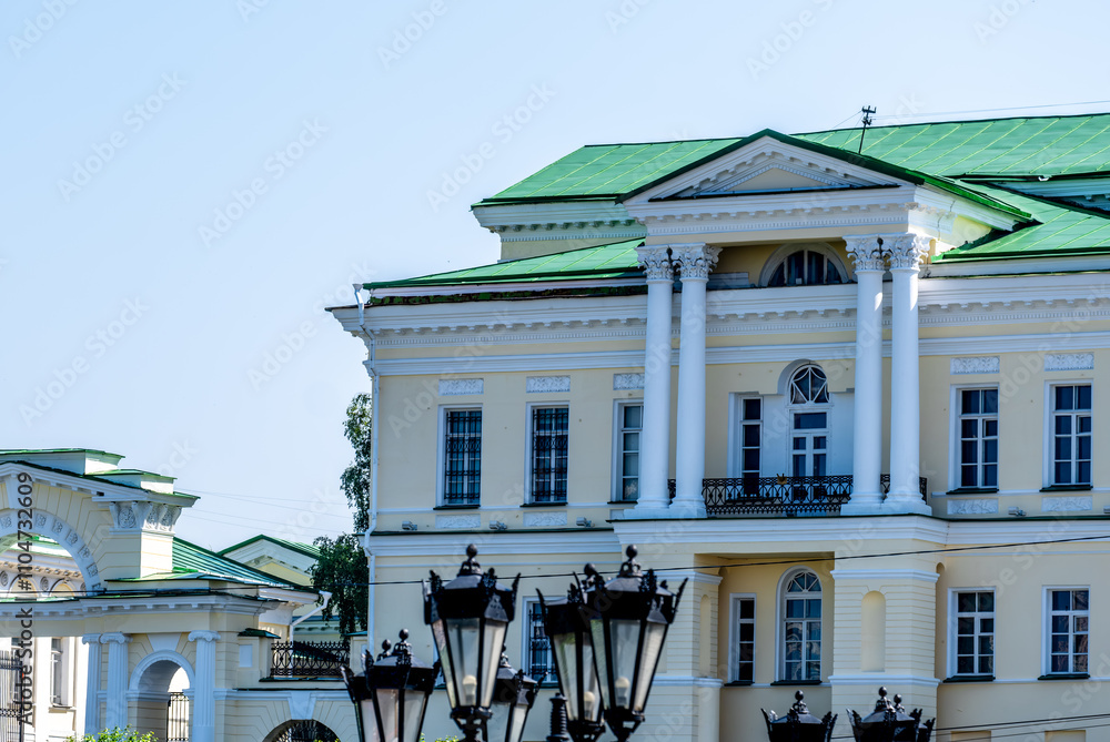 A mansion with columns in the city against the sky.