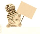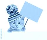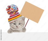 Cute kitten wearing a warm hat with pompon looking above blank banner and showing blank placard on wooden stick. isolated on white background