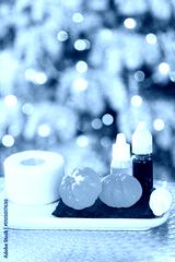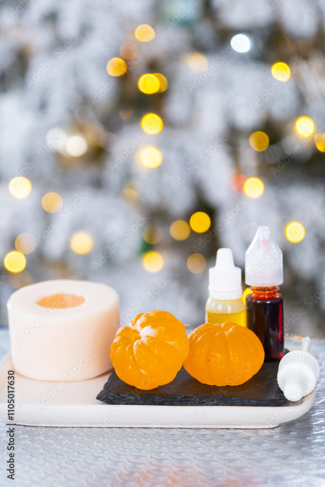 Handmade soap in the form of Orange tangerine with bottles of dye, flavor, a block of glycerin soap base, silicone mold, on background of Christmas tree with golden light. Soap as gift new year
