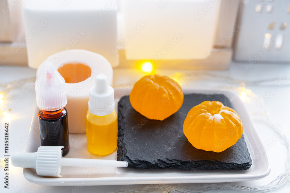 Handmade soap in the form of a tangerine with bottles of dye, flavor, a block of glycerin soap base, silicone mold, pipette. Soap as a gift, home-made
