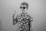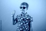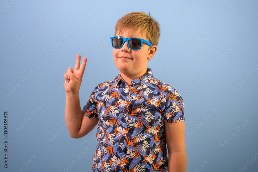 Cheerful boy in sunglasses and Hawaiian shirt on blue background 8-10 years old