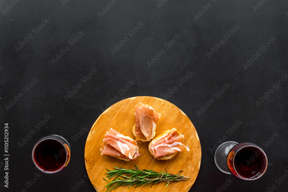 Spanish meal. Prosciutto ham on wooden board and glass of wine