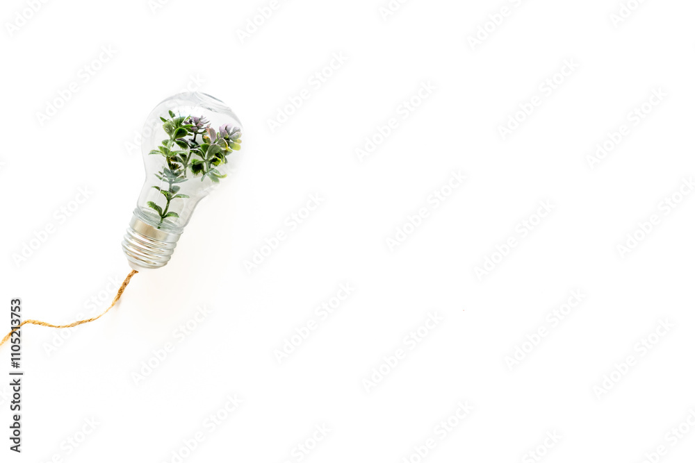 Light bulb with green plant, top view. Eco renewable energy concept.