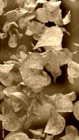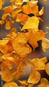 Freeze motion of flying fried potatoes chips on gradient yellow background