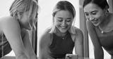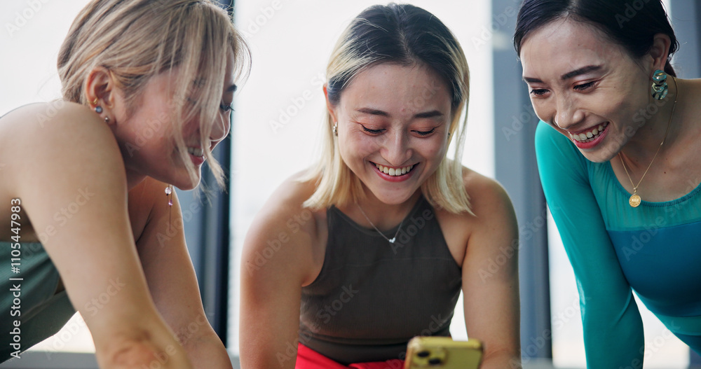 Phone, friends and women in dance studio with networking, communication or browsing social media. Smile, cellphone and Japanese ballerinas watching online video for classic technique at rehearsal.