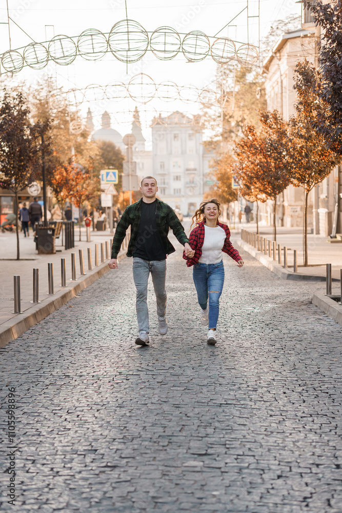 Joyful Young Couple Running Together on a Cobblestone Street in Autumn