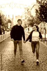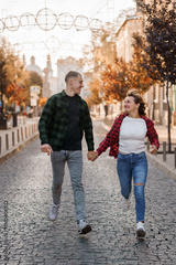 Young couple joyfully running hand in hand through a charming urban street adorned with autumn foliage