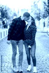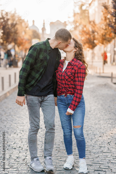 Romantic Kiss between Stylish Couple in Urban Setting