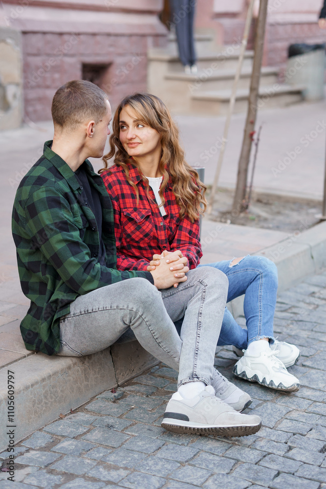 A Romantic Moment Between a Young Couple Sitting on a Cobblestone Street