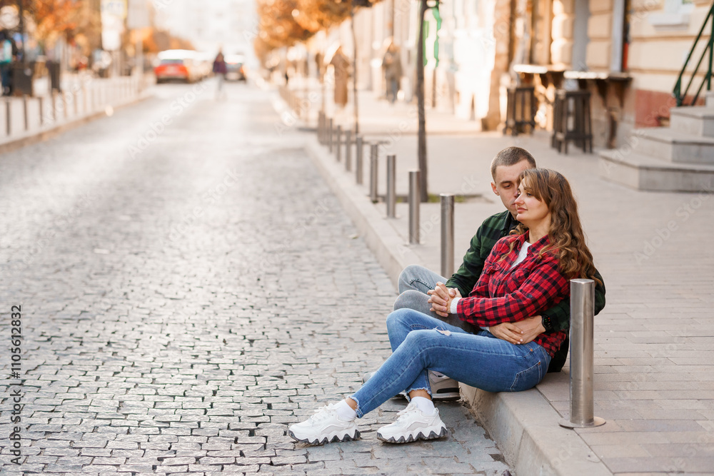 A Romantic Moment on a Cobblestone Street Surrounded by Autumnal Beauty