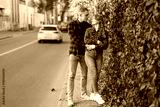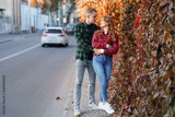 Romantic Autumn Embrace of a Fashionable Couple Surrounded by Vibrant Foliage