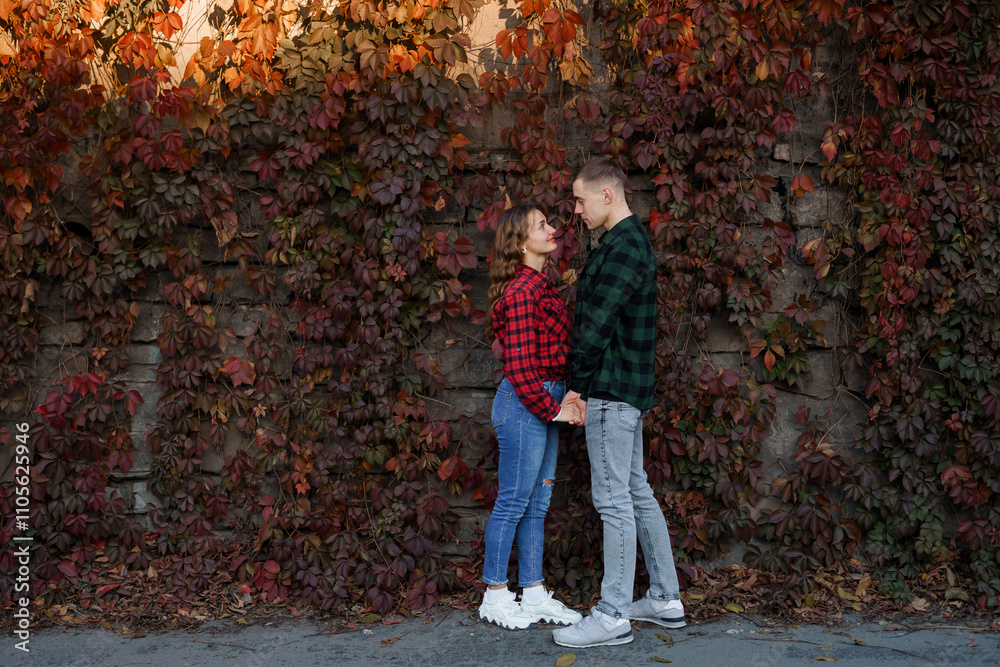 Adorable Couple Sharing a Tender Moment Against a Fall Foliage Background