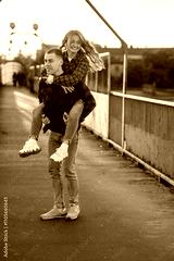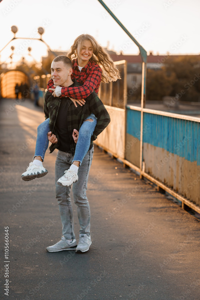 Joyful Couple Embracing Life on a Scenic Bridge at Sunset