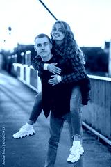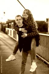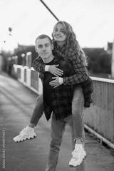 Joyful Young Couple Enjoying a Sunny Outdoor Moment on a Bridge