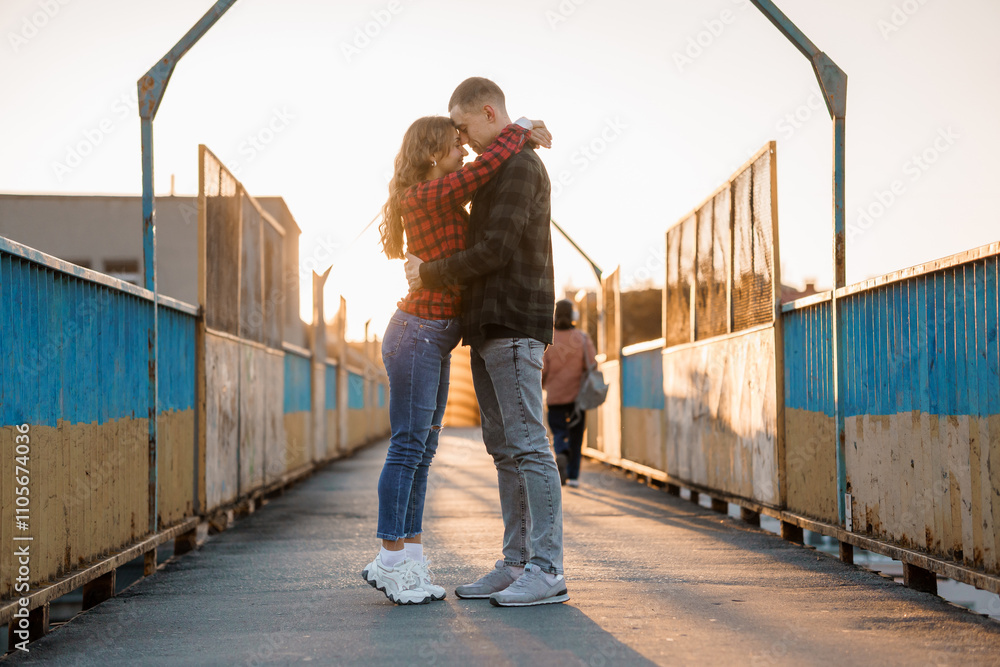 Romantic Couple Embracing on a Sunset-lit Bridge