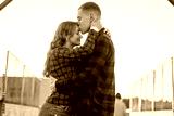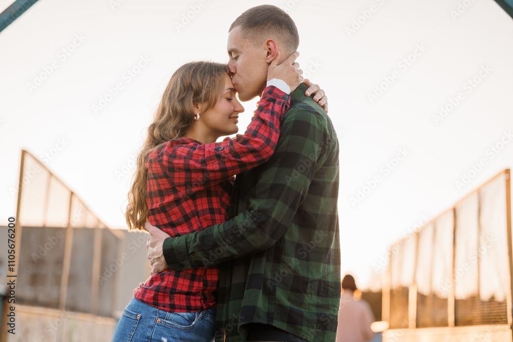 Intimate Embrace of a Stylish Couple at Sunset on a Bridge