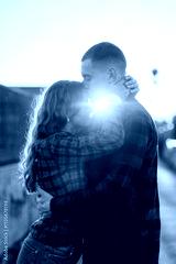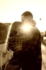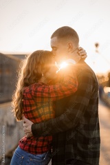Romantic Sunset Embrace of a Joyful Couple in Casual Attire