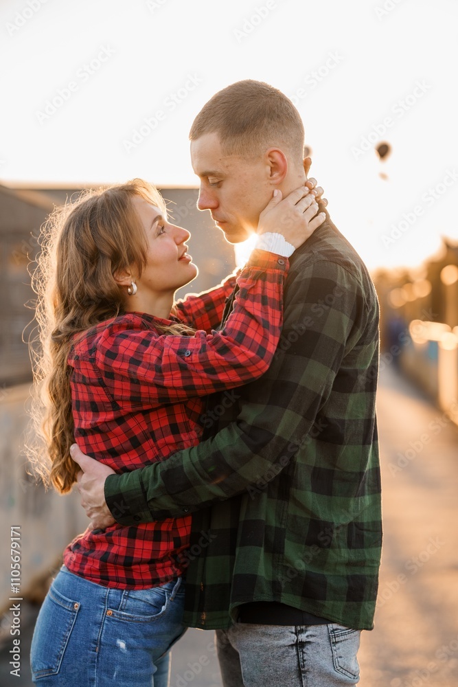Romantic Sunset Embrace of a Playful Couple in Flannel Shirts