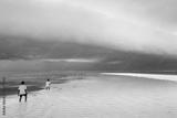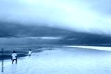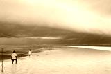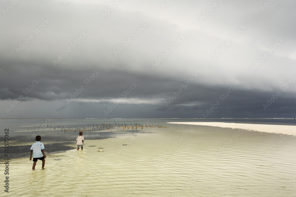 Children going in water near to seaweed plantation with storm cl
