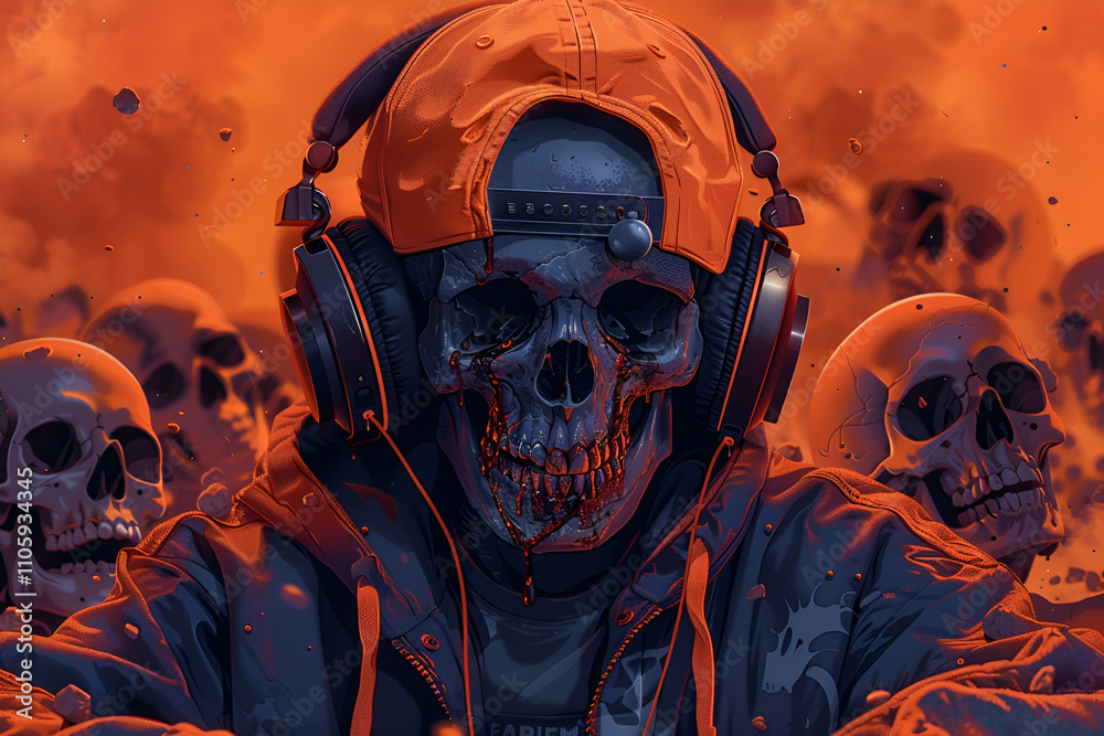 A skull spinning within a vortex of swirling graffiti strokes, with vibrant colors like red, orange, and purple creating chaotic patterns around it.