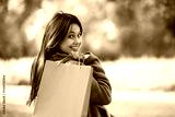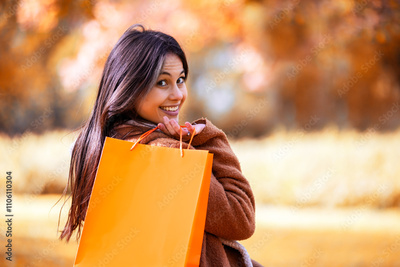 Young woman with shopping bags walking through colorful park on a sunny autumn day.