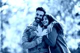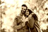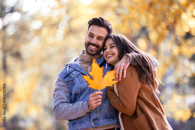 Young happy couple hugging and walking in the park. Colorful park on sunny autumn day.