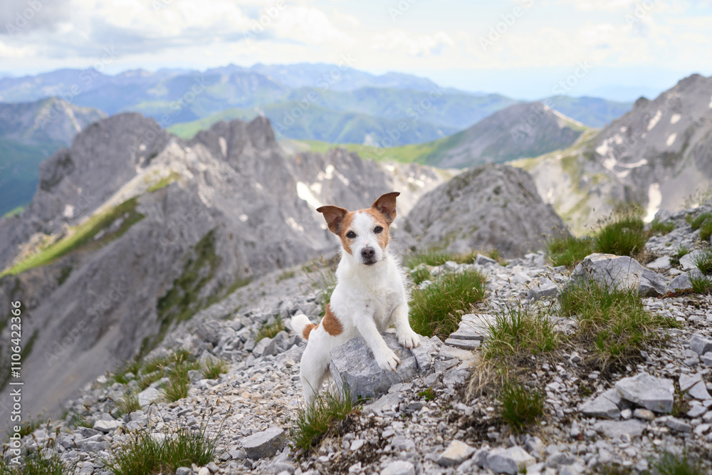 A small Jack Russell Terrier dog sits calmly on a rocky slope with rugged mountains providing a stunning backdrop. The serene moment captures the spirit of pets in the wild.