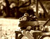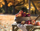 Gardening and harvesting. Fall apple crops harvesting in garden. Apple tree with fruits in wooden bowl on sunny fall day