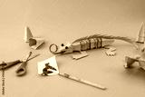 Recycled cardboard iguana craft with scissors, paintbrush, and blue paint on a light blue background. Studio craft photography with copy space. DIY and eco-friendly crafting concept for design