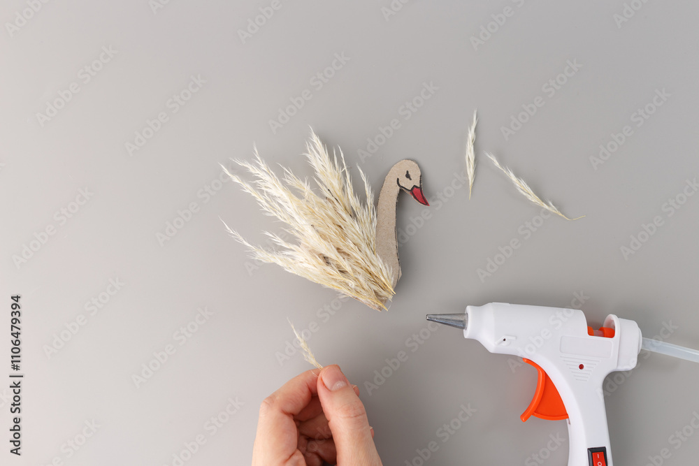 Eco-friendly DIY swan made from cardboard and pampas grass on grey background, natural crafting project for handmade decor and recycled art, sustainable decor inspiration for home and kids