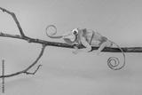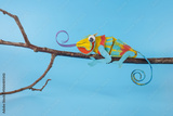 a colorful, artistic representation of a chameleon perched on a branch. with vibrant colors including blue, yellow, red, and purple. Its tongue is extended and curled, and its tail is also curled