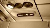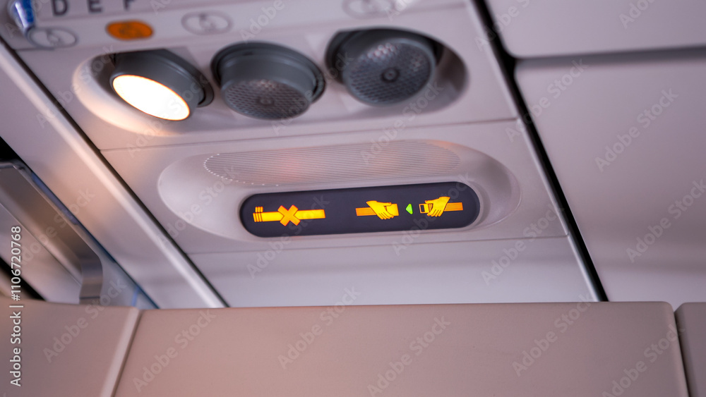 Closeup of an airplane safety light panel displaying seatbelt and no smoking