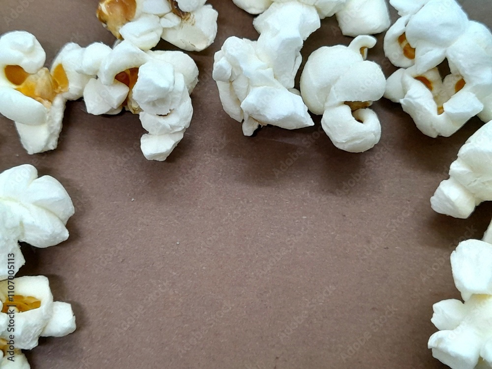 Popcorne close up with brown background.