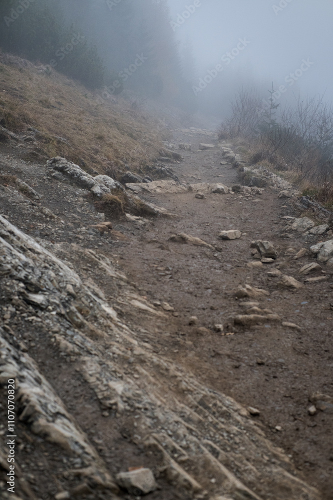 Mountain trail, road in the fog, mountain landscape, High Tatras.