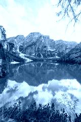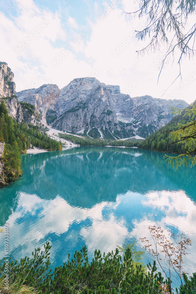 A beautiful mountain lake lago di braies with a blue sky in the background