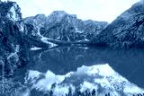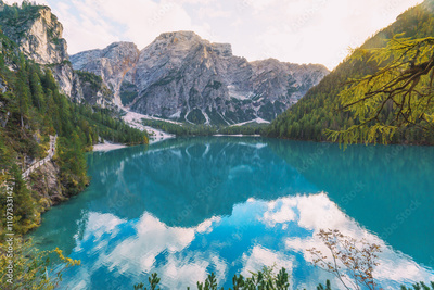 A beautiful mountain lake lago di braies with a blue sky in the background