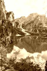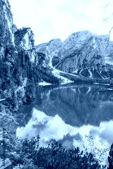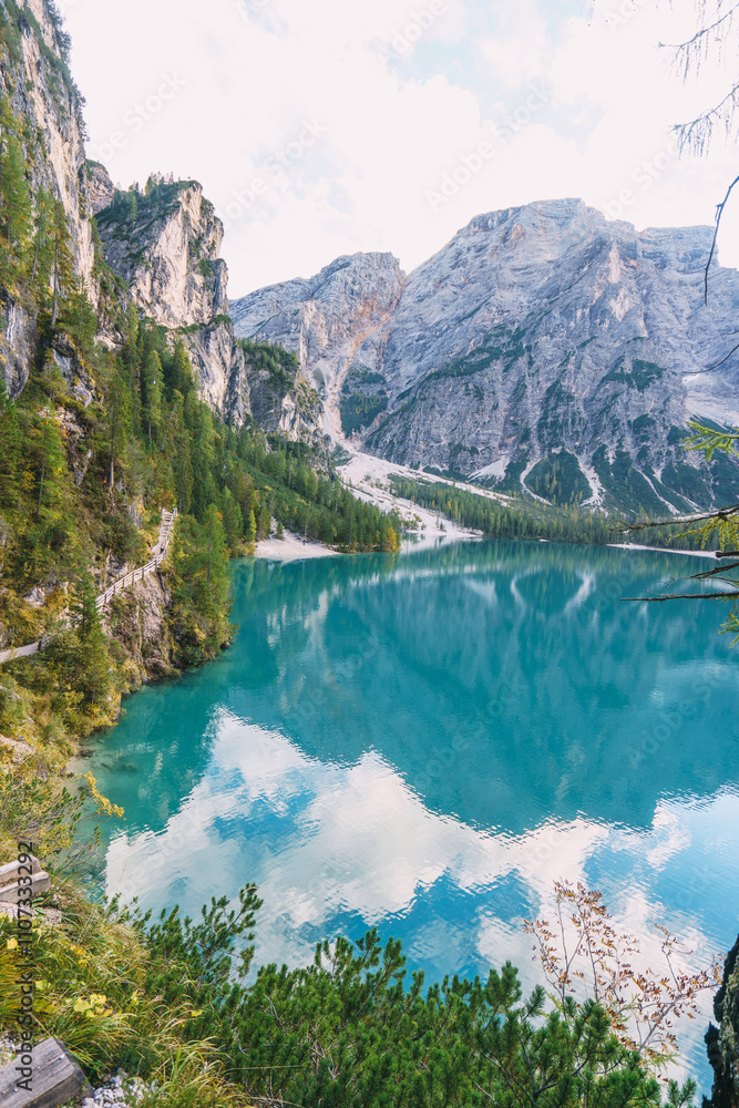 A beautiful mountain lake lago di braies with a blue sky in the background