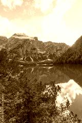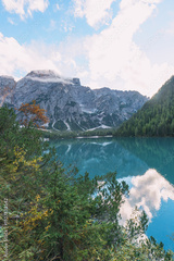 A beautiful mountain lake lago di braies with a blue sky in the background