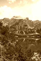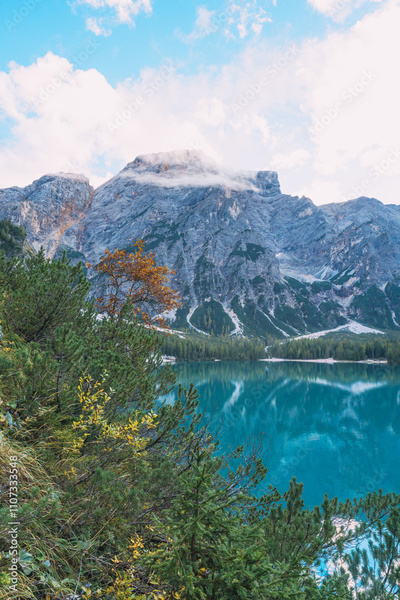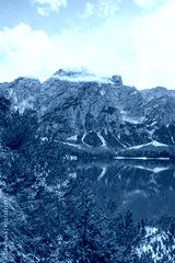 A beautiful mountain lake lago di braies with a blue sky in the background