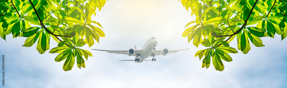 Airplane flying on blue sky. Sustainable aviation. Green airliner. Eco-friendly flight. Sustainable aviation fuel. Sustainable transportation. Aviation sustainability. Sustainable air travel future.
